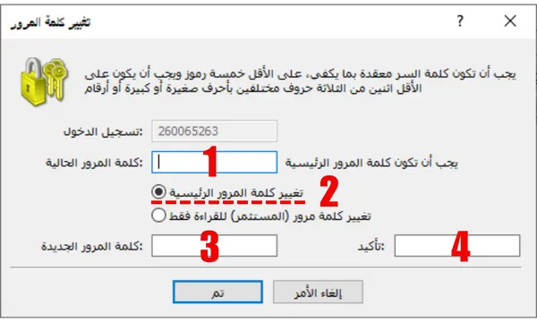 الخطوة الثالثة: أدخل كلمة المرور القديمة وعيّن كلمة المرور الرئيسية الجديدة