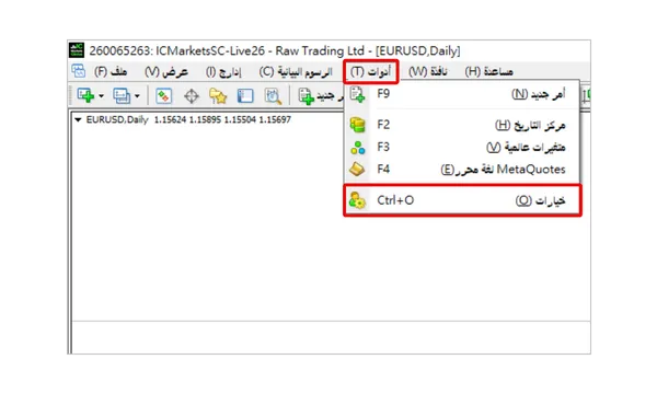 أولاً، في شريط القائمة العلوي لبرنامج MT4 الخاص بك، انقر فوق "أدوات"، ثم حدد "خيارات" من القائمة المنسدلة.