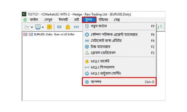 আপনার MT5 প্ল্যাটফর্ম খুলুন, উপরের টুলবারে "টুলস"-এ ক্লিক করুন, এবং তারপর ড্রপডাউন মেনু থেকে "অপশন" নির্বাচন করুন।