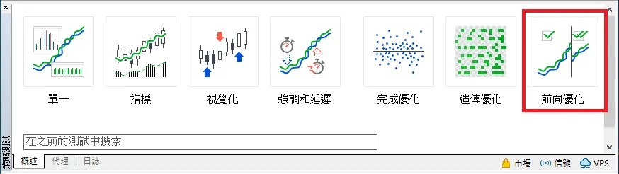 一些交易平台(例如 MT5)的策略测试器提供了「向前测试」(Forward Testing) 功能,可以帮助自动完成这个数据分割和测试的过程。