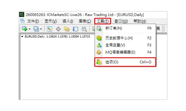 首先,请在您的 MT4 软件顶部菜单栏中,点击“工具”,然后在下拉菜单中选择“选项”。