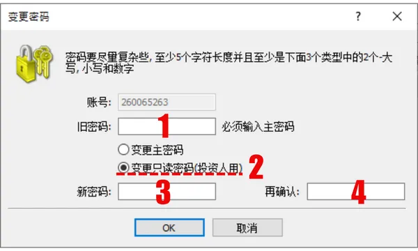 这是最关键的一步。在跳出的“变更密码”窗口中,请依次完成以下操作:- 旧密码: 输入您目前正在使用的“主密码”(也就是可以交易的那组密码)。