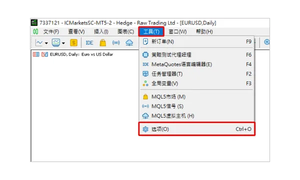 打开您的 MT5 程序,点击顶部工具栏的“工具(T)”,然后在下拉菜单中选择“选项(O)”。