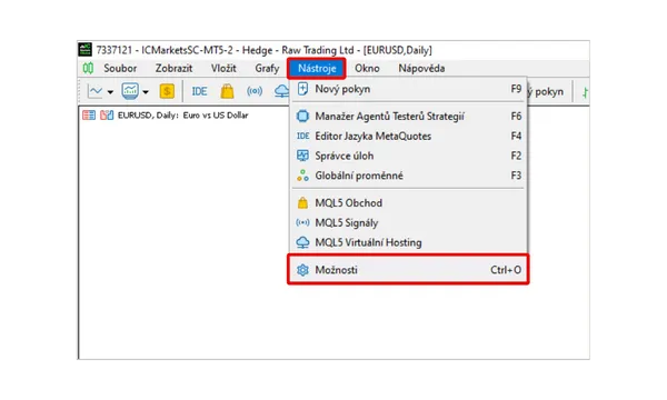 Otevřete platformu MT5, klikněte na „Nástroje“ v horní liště nástrojů a poté z rozevírací nabídky vyberte „Možnosti“.