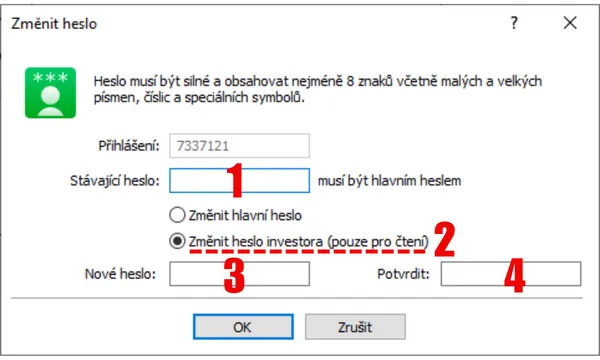 - Vyberte možnost: Klikněte na možnost „Změnit heslo investora (pouze pro čtení)“.