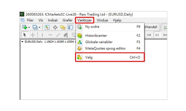 Først skal du i den øverste menulinje i din MT4-software klikke på "Værktøjer", og derefter vælge "Valg" fra rullemenuen.