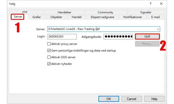 Trin 2: Gå til fanen "Server" og klik på "Skift"