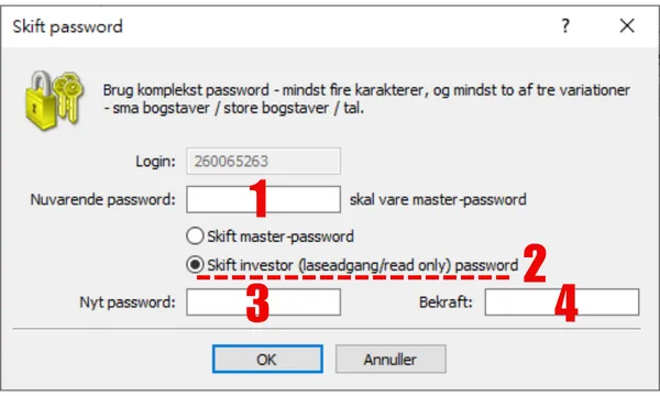- Skift: Vælg "Skift investor (læseadgang/read only) password".
