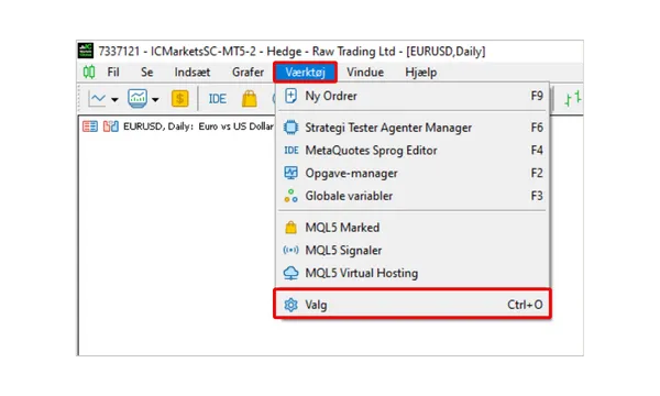 Åbn din MT5-platform, klik på "Værktøj" i den øverste værktøjslinje, og vælg derefter "Valg" fra rullemenuen.