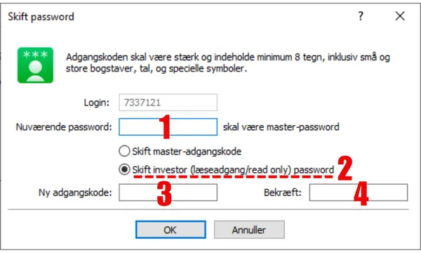 - Vælg mulighed: Klik på muligheden "Skift investor (læseadgang/read only) password".
