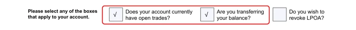 - Does your account currently have open trades?: Sæt kryds her, hvis kontoen har åbne positioner; systemet vil lukke positioner proportionalt ved overførsel.