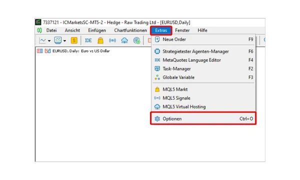 Öffnen Sie Ihre MT5-Plattform, klicken Sie in der oberen Symbolleiste auf „Extras“ und wählen Sie dann „Optionen“ aus dem Dropdown-Menü.