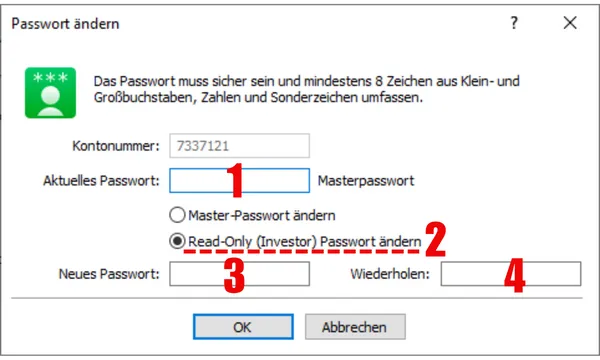 Zu teilende Informationen: Nach der Einrichtung müssen Sie anderen folgende Informationen zur Verfügung stellen: Ihr Handelskonto-Login, den Servernamen und das „Read-Only-Passwort“, das Sie gerade erstellt haben. Teilen Sie NIEMALS Ihr Master-Passwort.Berechtigungsunterschied: Denken Sie immer daran, dass das Master-Passwort volle Handelsrechte hat, während das Read-Only-Passwort nur Anzeigerechte hat.