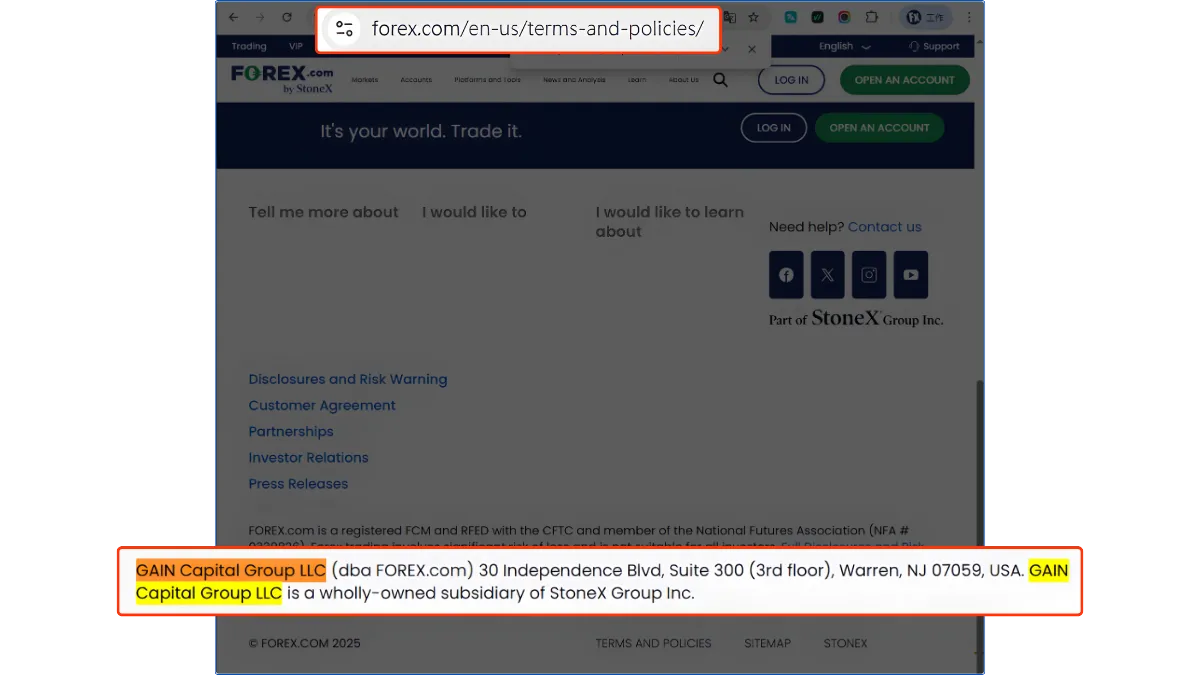Weil "FOREX.com" nur ein Markenname ist, während "GAIN CAPITAL" die registrierte juristische Person (Muttergesellschaft) ist. Sie müssen zur Seite „Rechtliche Bestimmungen“ der Broker-Website zurückkehren, um zu bestätigen, ob dort angegeben ist, dass sie von GAIN Capital betrieben wird.