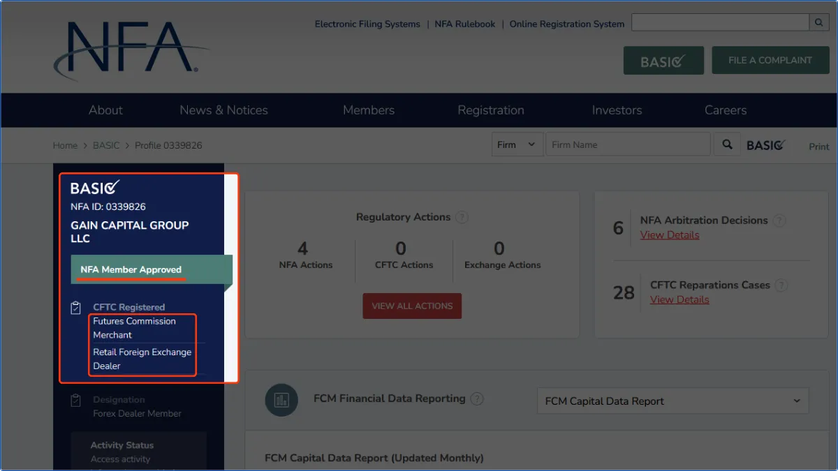 Regulierungsstatus von FOREX.com (GAIN Capital) als genehmigtes Mitglied bei der US NFA angezeigt