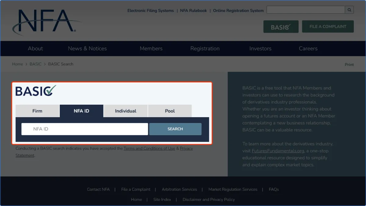 Um zu überprüfen, ob eine Plattform wirklich in den USA reguliert ist, müssen Sie nur das von der NFA bereitgestellte BASIC (Background Affiliation Status Information Center) System verwenden.