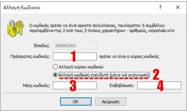 Αυτό είναι το πιο κρίσιμο βήμα. Στο παράθυρο «Αλλαγή κωδικού» που εμφανίζεται, ολοκληρώστε τις παρακάτω ενέργειες με τη σειρά:- Τρέχων κωδικός πρόσβασης: Εισαγάγετε τον τρέχοντα «Κύριο Κωδικό Πρόσβασης» (αυτόν που χρησιμοποιείτε για τις συναλλαγές).