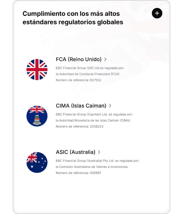 Para servir a los traders internacionales que buscan una alta eficiencia de capital, EBC ofrece servicios a través de entidades en San Vicente (SVG) y Caimán (CIMA) (Cayman Reference No: 2038223). Esto permite al grupo ofrecer un apalancamiento competitivo (hasta 1:500) y servicios de copy trading flexibles dentro de un marco de cumplimiento.