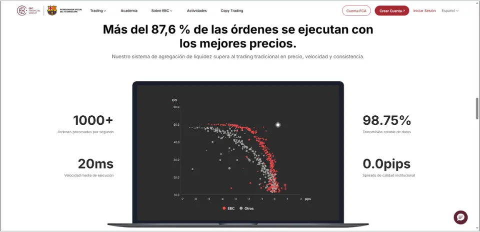 EBC despliega servidores en centros de datos financieros de primer nivel como LD4 en Londres, conectados directamente a través de fibra óptica dedicada. Una velocidad promedio de ejecución de órdenes de unos 20 milisegundos crea un entorno de hardware ideal para el trading programático con EA o estrategias de alta frecuencia (HFT) que dependen de la velocidad.2. Mecanismo Anti-Ensanchamiento Basado en Liquidez Profunda