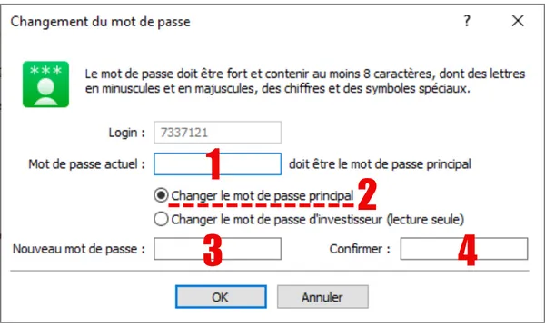 C'est l'étape la plus critique. Dans la fenêtre "Changement du mot de passe", veuillez effectuer les actions suivantes dans l'ordre :- Mot de passe actuel : Veuillez saisir votre (ancien) "mot de passe principal" actuel.