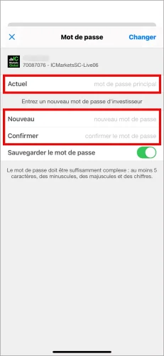 Ceci est la dernière étape. Veuillez effectuer les opérations suivantes dans l'ordre sur cette page :- Mot de passe actuel : Entrez votre « Mot de passe principal » actuel (celui utilisé pour le trading).