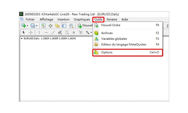 Tout d'abord, dans la barre de menu supérieure de votre logiciel MT4, cliquez sur « Outils », puis sélectionnez « Options » dans le menu déroulant.