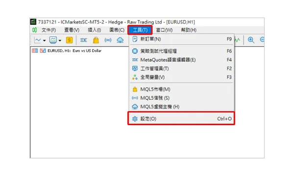 打開您的 MT5 程式,點擊頂部工具列的「工具」,然後在下拉選單中選擇「設定」。
