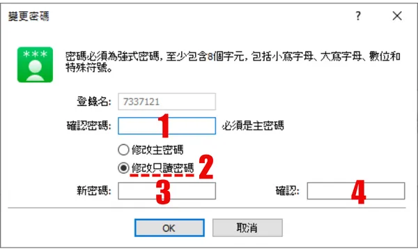 這是最關鍵的一步。在「變更密碼」視窗中,請依序完成以下操作:- 當前密碼: 請輸入您最高權限的「主密碼」。