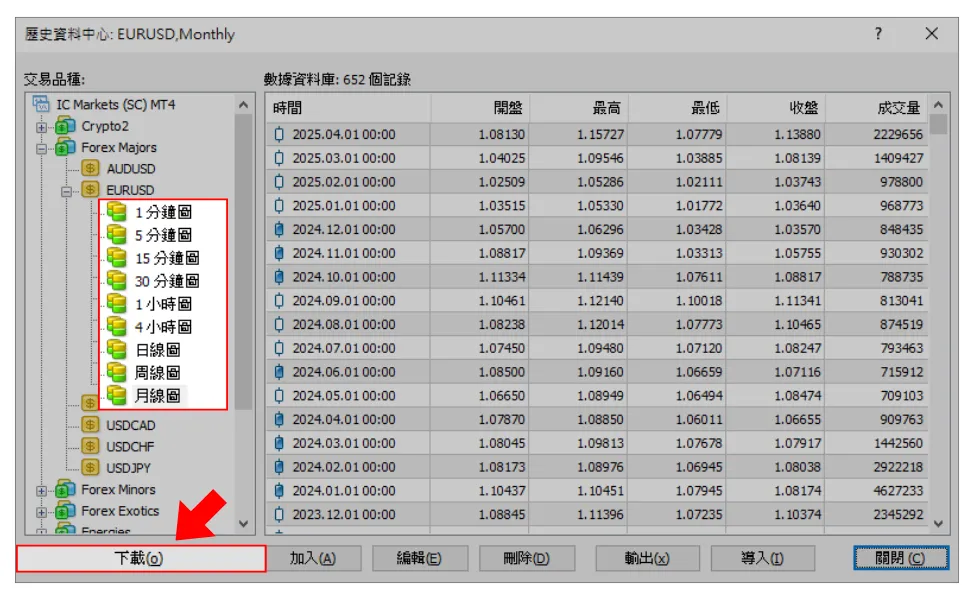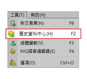 無論選用哪一種模式進行回測,都必須先擁有相應的歷史數據記錄。在 MT4 的回測流程中,獲取券商提供的內部歷史價格數據,需要先至平台的工具列進行下載。