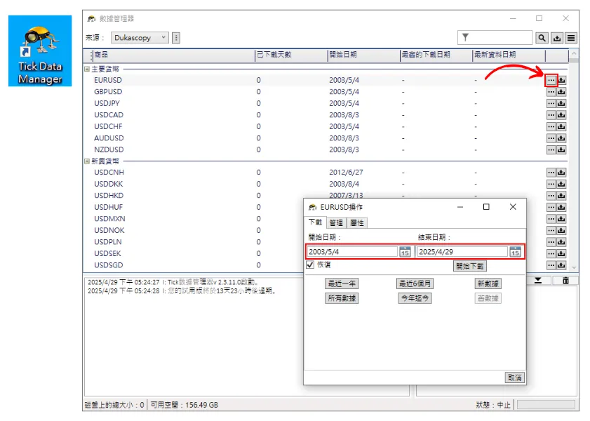在首次下載時,建議點擊後方的設定按鈕(圖中紅色圈圈處的三個點),用以設定您希望下載數據的「起始與結束日期區間」。