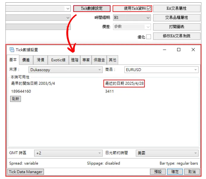 另一個是「Tick 數據設定 (Tick data settings)」,點擊後會彈出一個進階設置窗口,這裡主要是用來確認 TDS 已成功讀取到您最新下載的價格數據。