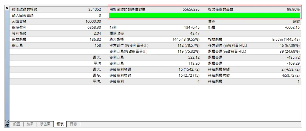 啟用了 TDS 之後,MT4 便能輕鬆地執行出模型品質高達 99.9% 的回測。只有基於如此高品質數據生成的回測報告,才具備較高的參考價值,能更真實地反映策略的歷史表現。