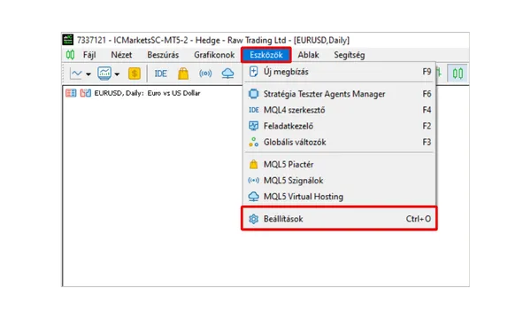 Nyissa meg az MT5 platformot, kattintson az „Eszközök” elemre a felső eszköztáron, majd válassza a „Beállítások” lehetőséget a legördülő menüből.
