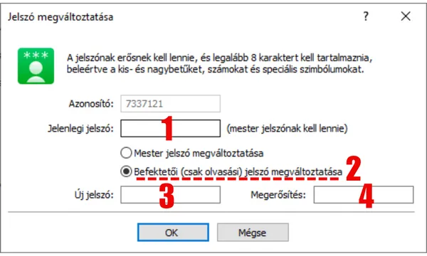 - Opció kiválasztása: Kattintson a „Befektetői (csak olvasási) jelszó megváltoztatása” opcióra.