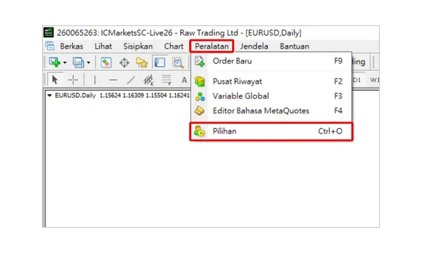 Pertama, di bilah menu atas perangkat lunak MT4 Anda, klik "Peralatan", lalu pilih "Pilihan" dari menu tarik-turun.