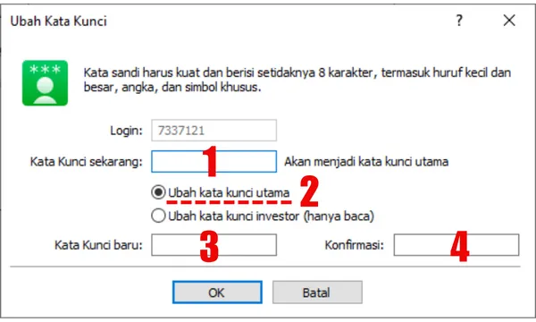 Kata Kunci Utama (Master Password) MetaTrader 5 (MT5) Anda, yang juga dikenal sebagai "Kata Kunci Trading", adalah kata kunci dengan otoritas tertinggi untuk akun trading Anda. Ini memungkinkan Anda melakukan semua operasi di MT5, termasuk menempatkan order, menutup posisi, memodifikasi order, dan mengubah kata kunci.Untuk memaksimalkan keamanan dana trading Anda, mengubah kata kunci utama secara rutin adalah kebiasaan keamanan siber yang sangat penting. Sangat disarankan agar Anda segera mengubah kata kunci Anda dalam situasi berikut: