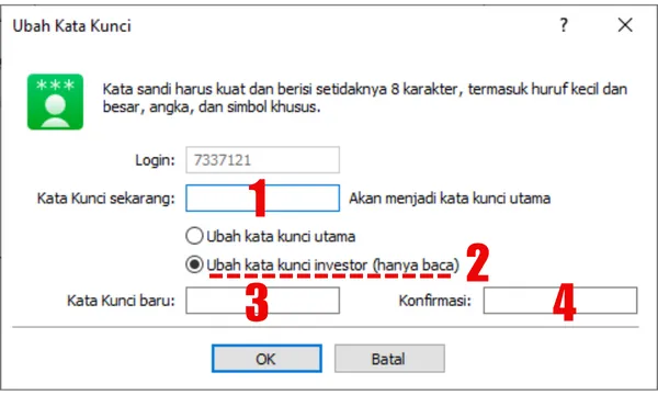 Informasi untuk Dibagikan: Setelah mengaturnya, informasi yang perlu Anda berikan kepada orang lain adalah: login akun trading Anda, nama server, dan "Kata Kunci Hanya Baca" yang baru saja Anda buat. JANGAN PERNAH membagikan kata kunci utama Anda.Perbedaan Izin: Selalu ingat, kata kunci utama memiliki hak trading penuh, sedangkan kata kunci hanya baca hanya memiliki hak untuk melihat.