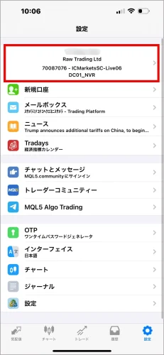 設定ページの最上部に、あなたの氏名、口座番号、サーバー情報が表示されているエリアがあります。このエリアを直接タップしてください。