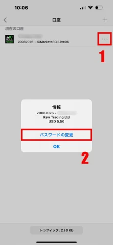 口座詳細ページに移動したら、右下にある3つの点「•••」のアイコンを見つけてタップすると、オプションメニューが表示されます。次に、「パスワードの変更」をタップしてください。