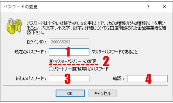 これが最も重要なステップです。ポップアップ表示される「パスワードの変更」ウィンドウで、以下の操作を順番に完了してください。- 現在のパスワード: 現在使用している古い「マスターパスワード」を入力します。
