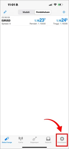 Buka Aplikasi MT4 anda dan ketik ikon "Penetapan" di penjuru kanan bawah untuk masuk ke menu tetapan utama.