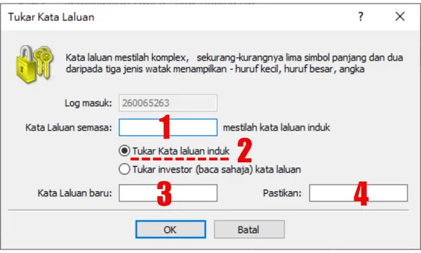 Kata Laluan Induk (Master Password) MetaTrader 4 (MT4) anda, juga dikenali sebagai "Kata Laluan Dagangan", ialah kunci kepada tahap kuasa tertinggi untuk akaun anda. Memilikinya bermakna mempunyai kawalan penuh ke atas akaun, termasuk semua operasi seperti melaksanakan dagangan dan mengubah suai pesanan.Untuk melindungi dana anda, adalah amat disyorkan agar anda menukar kata laluan induk anda dengan segera dalam situasi berikut: