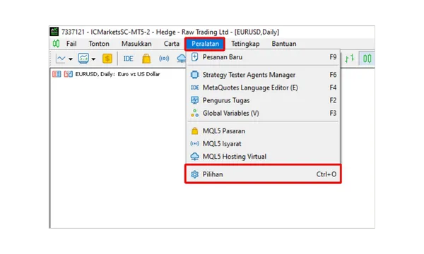 Buka platform MT5 anda, klik pada "Peralatan" di bar alat atas, dan kemudian pilih "Pilihan" daripada menu lungsur turun.