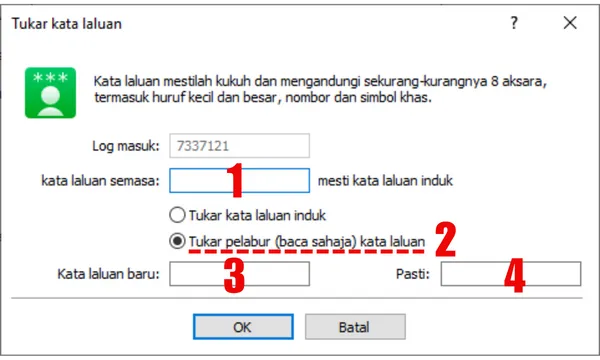 Ini adalah langkah yang paling penting. Dalam tetingkap "Tukar kata laluan", sila lengkapkan tindakan berikut mengikut urutan:- kata laluan semasa: Sila masukkan "kata laluan induk" anda (yang mempunyai kebenaran penuh).