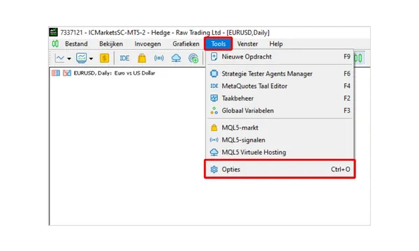 Open uw MT5-platform, klik op "Tools" in de bovenste werkbalk en selecteer vervolgens "Opties" in het vervolgkeuzemenu.