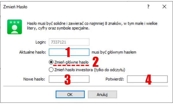 A2: Nie. Hasło główne i hasło inwestora są niezależne. Zmiana hasła głównego nie wpłynie na żadne hasło inwestora, które ustawiłeś wcześniej.