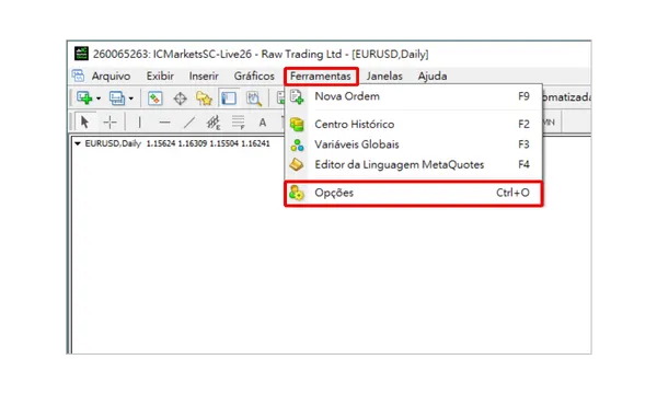 Primeiro, na barra de menus superior do seu software MT4, clique em "Ferramentas" e, em seguida, selecione "Opções" no menu pendente.