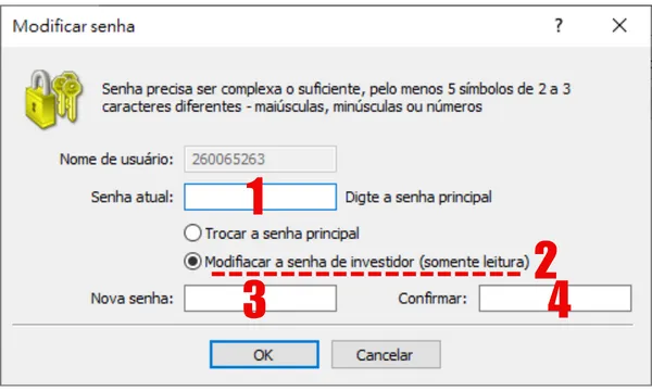 Este é o passo mais crucial. Na janela "Modificar Senha" que aparece, por favor, complete as seguintes operações por ordem:- Senha atual: Introduza a sua "Senha Mestra" atual (a que utiliza para negociar).