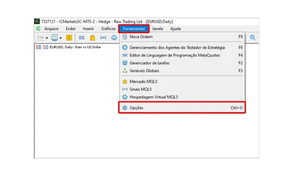 Abra a sua plataforma MT5, clique em "Ferramentas" na barra de ferramentas superior e, em seguida, selecione "Opções" no menu suspenso.