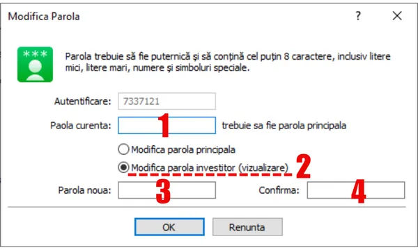 - Bifați opțiunea: Faceți clic pe opțiunea „Modifica parola investitor (vizualizare)”.